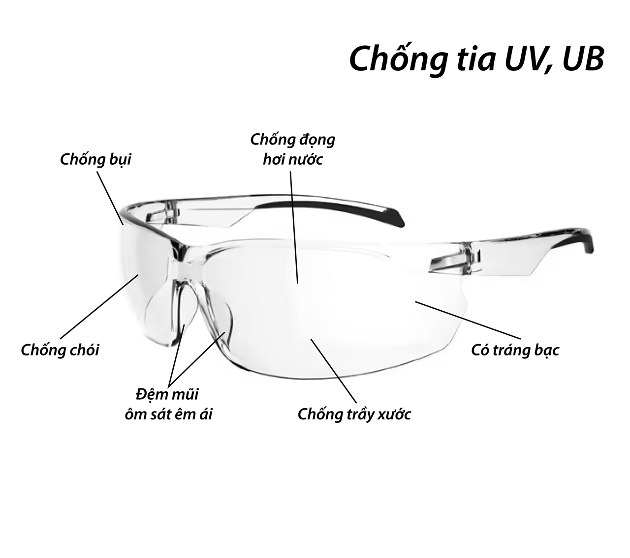 Công dụng: bảo kê mắt khỏi khói bụi, chất độc hại. dùng trong môi trường phổ thông.